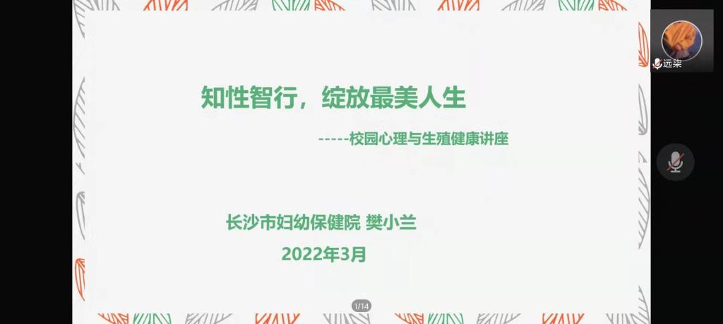 3月24日晚,为帮助女大学生提升心理素质,普及生殖健康知识,长沙市妇幼保健院主任医师樊小兰作为主讲人线上开讲,为外语和食品学院女生带来了一场校园心理与生殖健康线上讲座。