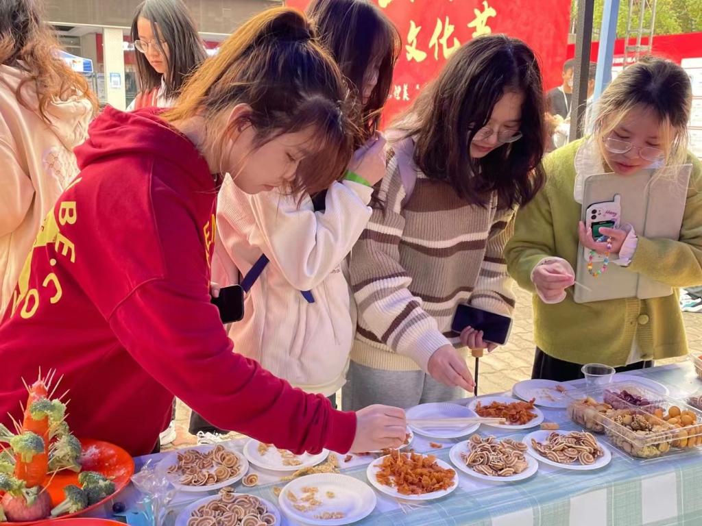 果蔬拼盘玲琅满目,刀工比赛妙手生花……在美食联展活动区,十支入围决赛的队伍同台展示厨艺。队员们精心准备的莆田卤面、血酱鸭、平遥牛肉、海鲜焖子、驴打滚等地方特色美食飘香四溢,令人垂涎欲滴,吸引同学们驻足品尝。美食交换坪前排起长队,同学们一起分享舌尖上的美食,现场还搭建品酒等特色展位,食品学院师生则亲手制作纸杯蛋糕,邀请师生共同享受新鲜出炉的美味。