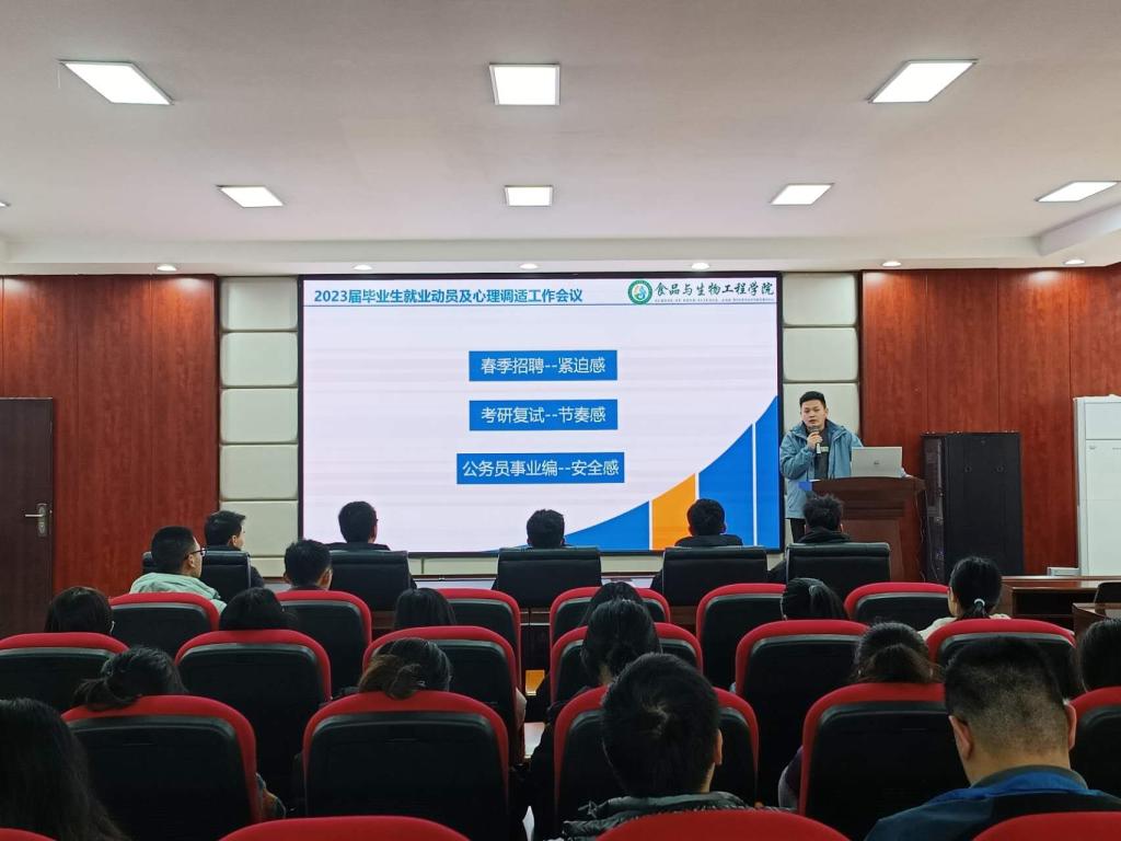 为进一步做好学院2023届毕业生就业工作,2月22日下午,食品学院于工三A320会议室召开2023届毕业生就业动员及心理调适工作会议,本次会议由学院就业辅导员兰贵辉主持,2023届毕业研究生、本科生共100余人参加。