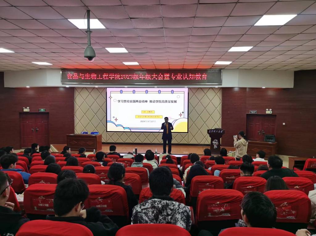 为进一步做好学院2023级新生专业认知教育,加深新生对学院、专业的认识程度,增强专业认同感,激励2023级新生在新学期继续努力学习,3月17日晚,食品学院于文科楼A200举行2023级年级大会暨专业认知教育。会议由年级辅导员兰贵辉主持,学院党委书记高顺利、院长王建辉、副书记练黎旋、副院长方芳出席此次活动,2023级全体新生参加。