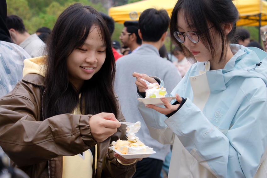 活动现场,由企业与食品学院烘焙研发应用中心联合出品的巨型水果蛋糕引得众多同学驻足,大排长龙;独具学院特色的自酿啤酒,掀起了一场热火朝天的“狂欢盛宴”;美食联展区钵钵鸡、锅巴洋芋、河南胡辣汤、淄博炒锅饼、南昌拌粉等地方特色美食香气氤氲、勾人馋涎。现场还设置了“游戏+美食”主题活动,让同学们在游戏中了解美食发源地、竞猜美食谜底,在欢乐中树立健康饮食观念,营造良好饮食文化氛围。
