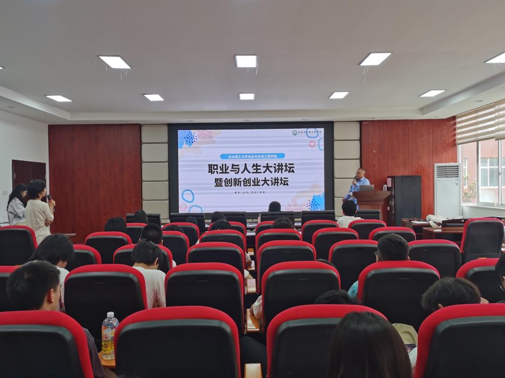 5月30日下午,长沙理工大学食品学院职业与人生大讲坛暨创新创业大讲坛于工科三号楼A320顺利举行。湖南开天新农业科技有限公司董事长、91届校友胡再明师兄受邀回到母校,现场与学弟学妹们分享成长经历、交流人生感悟,吸引了100余名师生聆听。