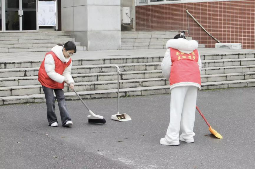 学院75名志愿者身着红色马甲,手持扫把等卫生工具,分组前往指定清洁区域进行清洁工作。志愿者们分工合作、相互配合,累计清扫教室15间,清理卫生死角20处,规整自行车70余辆,教学区、阅览区及校园公共区域面貌焕然一新。