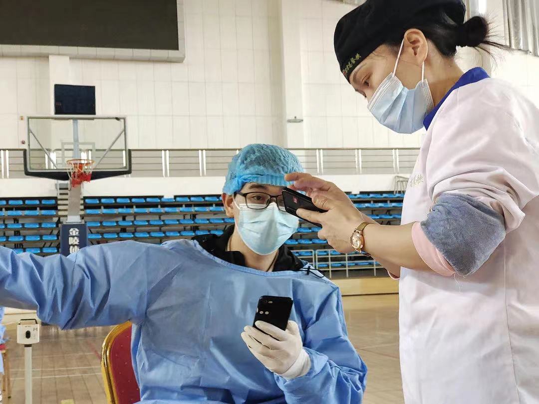 图5 李虹辉老师在体育馆参加核酸检测志愿者工作