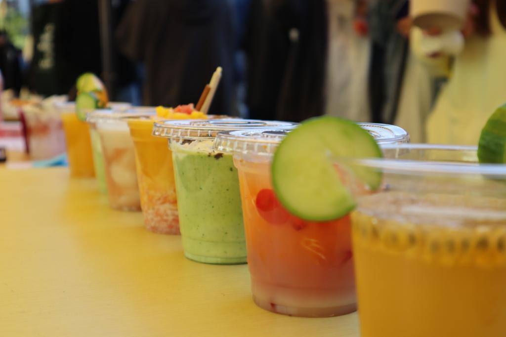 美食联展活动同台展示厨艺,各团队精心准备的拔丝地瓜、小炒黄牛肉、福鼎肉片、胡辣汤等地方特色美食,飘香四溢,令人垂涎欲滴,吸引同学们驻足品尝。果蔬饮品绚丽缤纷,刀工比赛妙手生花,创意与美食交汇,一道道精美的作品叫人叹为观止。美食交换区前排起长队,一起分享心尖上的美食,串联起天涯海角的味道。知名白酒品牌茅台搭建特色展位,邀请同学们共品酒香之浓厚,用一场微醺派对,迎接美食狂欢。“竹下忘言对紫茶,全胜羽客醉流霞”,以张家界“莓茶”为基的各式茶饮,如兰在舌,沁人心脾,搭配食品学院师生亲手制作的纸杯蛋糕,收获一致好评,全校师生齐聚一堂共享舌尖上的美味。