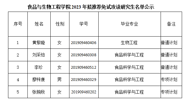 根据《关于做好长沙理工大学2023年推荐优秀应届本科毕业生免试攻读研究生工作的通知》和《长沙理工大学推荐优秀应届本科毕业生免试攻读研究生实施办法》(长理工大教〔2021〕11号)等文件精神,经个人申请、专业(类)遴选、资格审查、学院推免生遴选与审核鉴定工作小组综合评定,学院拟推荐黄紫璇等5名学生为2023年免试攻读硕士研究生人选,其中普通计划3人、专项计划2人、其中专项计划限推本校;现将拟推荐结果进行公示(名单见附表),公示期为2022年9月19日至2021年9月21日。
