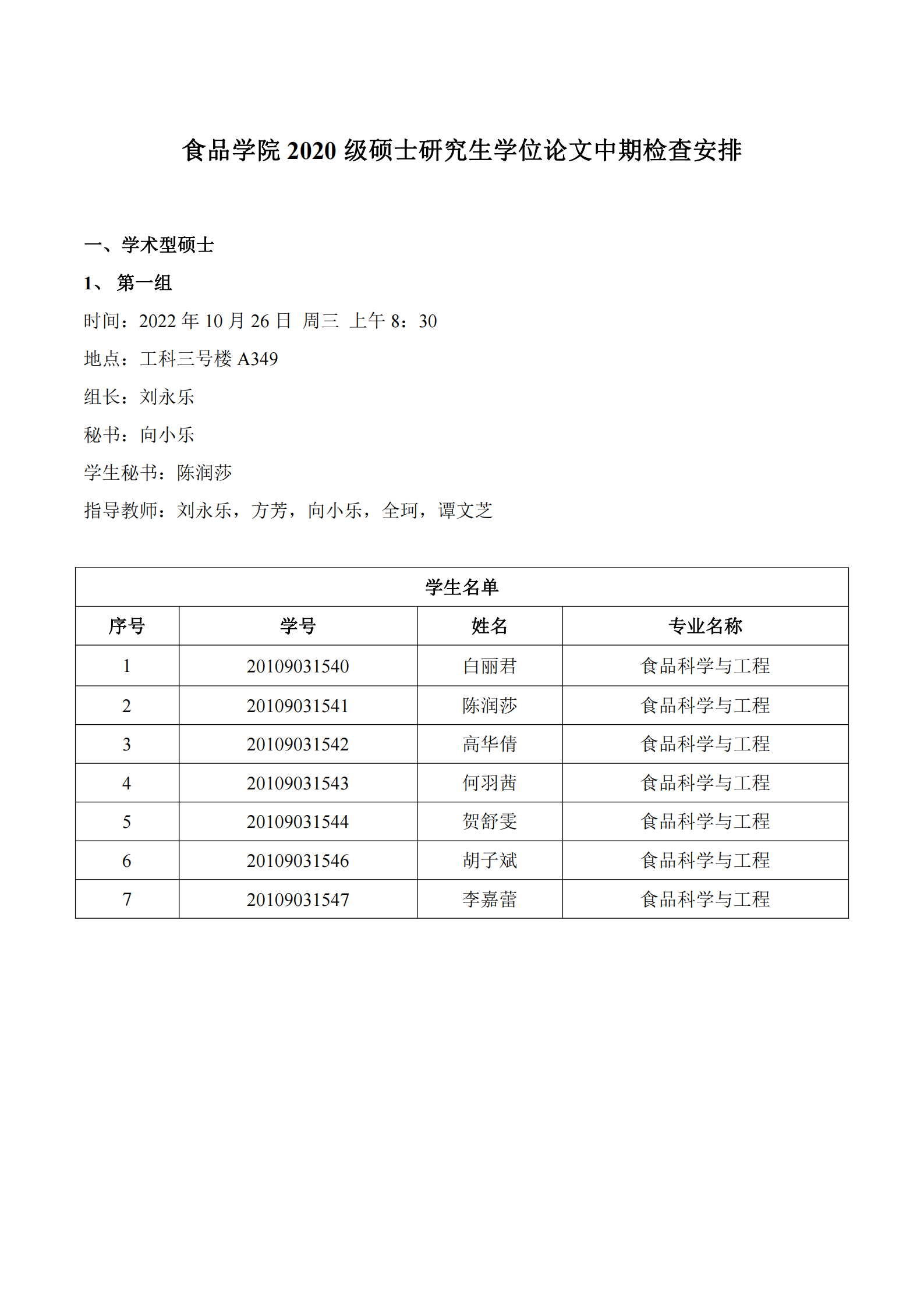 食品学院2020级硕士研究生学位论文中期检查安排