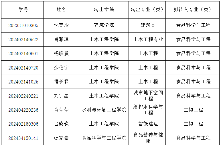 根据学校《长沙理工大学本科生转专业管理办法》和《食品与生物工程学院2024级本科生转专业工作方案》的相关规定,经学生个人申请,学院转专业工作小组考核,现将本院2024级本科生转专业拟转入名单进行公示,公示期为2025年2月25日-2月28日。如有异议,可在公示期内以书面形式向食品学院教务办实名反映,电话:0731-85258727。
