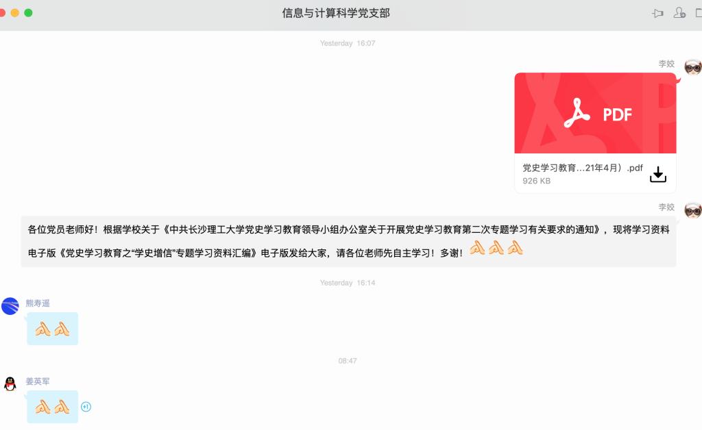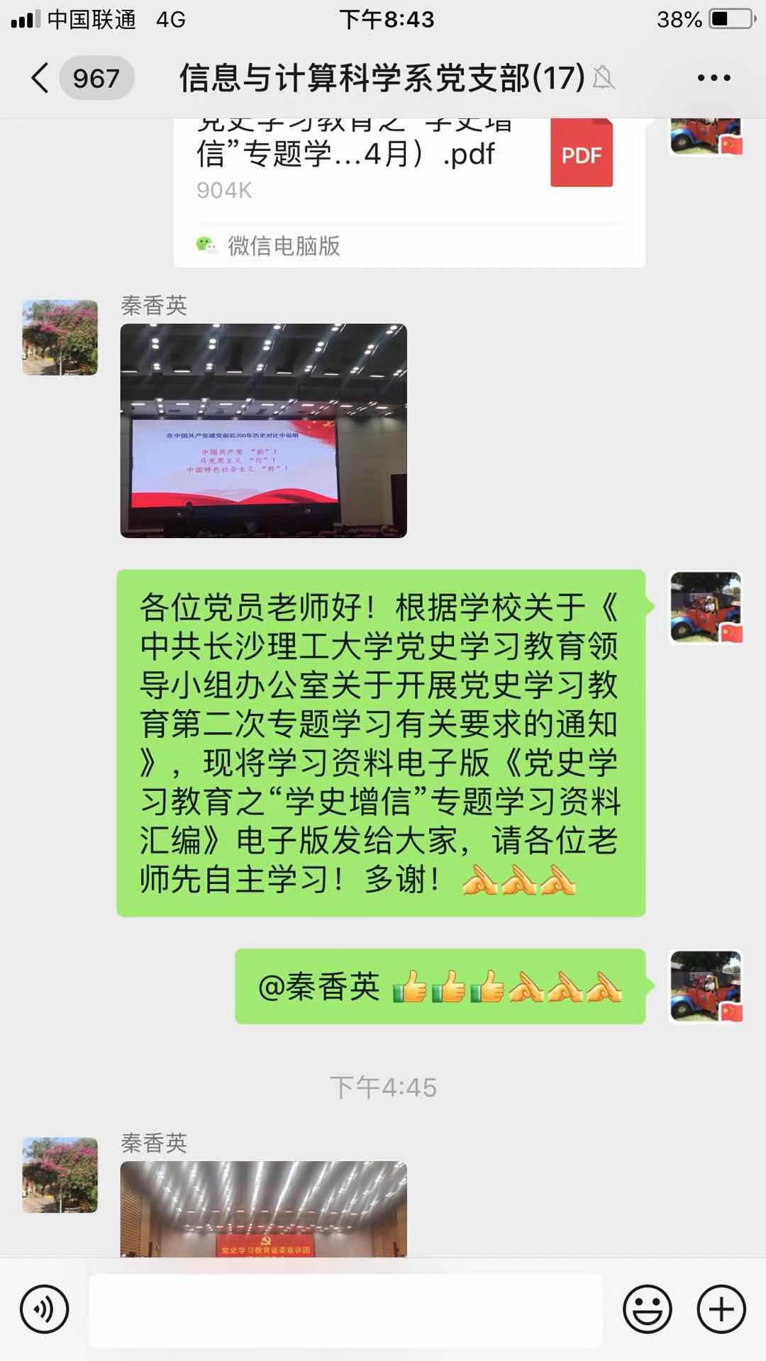 4月13日下午,根据《中共长沙理工大学党史学习教育领导小组办公室关于开展党史学习教育第二次专题学习有关要求的通知》以及学院党委部署,信息与计算科学系党支部开展了“学史增信” 专题学习。活动由支部书记李姣同志主持。