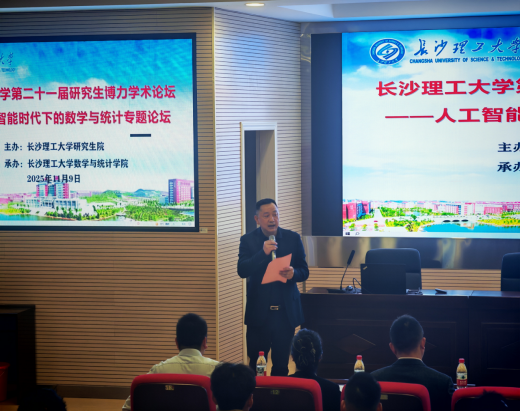 11月9日上午8:30,长沙理工大学第二十一届研究生博力学术论坛——“人工智能时代下的数学和统计”专题论坛,在云塘校区理科楼A200隆重开幕。本次论坛特邀湖南师范大学李利平教授、中南大学戴斌祥教授、周岳教授作大会主题报告。数学与统计学院党委副书记(主持工作)向永生、副院长李姣,校研究生院副院长(挂职)郎广名等领导出席了开幕式。论坛开幕式由学院副院长胡海军主持,学院师生共计200余人参加了此次研究生学术论坛。
