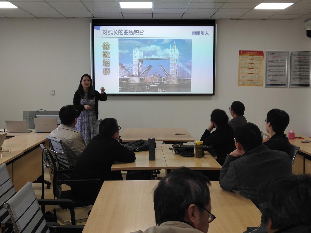 吴烨老师在去年的湖南省信息化教学比赛中获得了湖南省一等奖,此次教研活动由吴老师给全系老师主讲了“对弧长的曲线积分”的课堂教学示范课。吴老师从现实生活中的实例出发,引出了“对弧长的曲线积分”的数学定义,进而介绍了它的性质,重点介绍了它的计算方法。