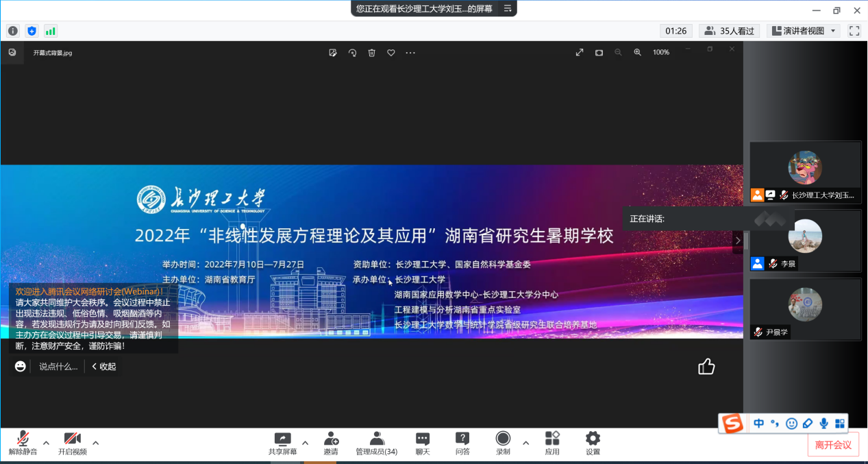 7月27日,随着欧洲科学院院士、香港城市大学杨彤教授所做的“Gevrey函数空间prandtl型方程的全局适定性”学术前沿报告的结束,为期3周的2022年“非线性发展方程理论及其应用”湖南省研究生暑期学校暨研究生博力学术论坛落下帷幕。
