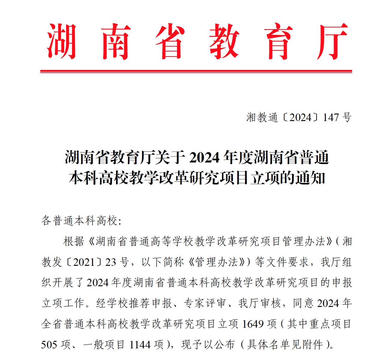 近日,湖南省教育厅发布关于2024年度湖南省普通本科高校教学改革研究项目立项的通知,我院熊寿遥老师团队、谭艳祥老师团队主持的项目立项湖南省教研教改重点项目,周潘岳老师团队主持的项目立项湖南省教研教改一般项目。