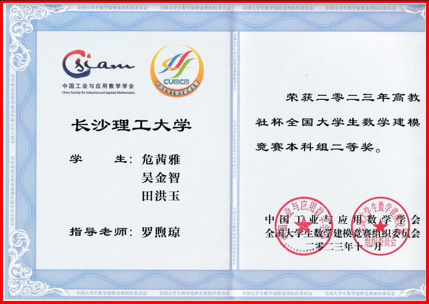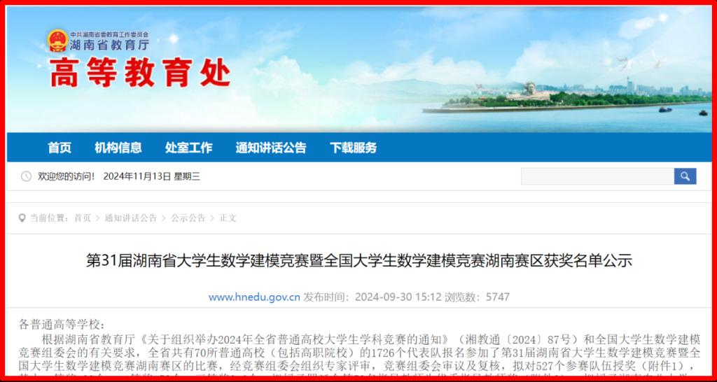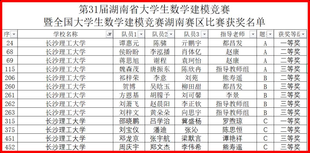 同时,近日,湖南省教育厅高等教育处发布了“第31届湖南省大学生数学建模竞赛暨全国大学生数学建模竞赛湖南赛区获奖名单公示”的通知,雷竞技官网在第31届湖南省大学生数学建模竞赛暨全国大学生数学建模竞赛湖南赛区的比赛中获得一等奖2项,二等奖4项,三等奖7项。