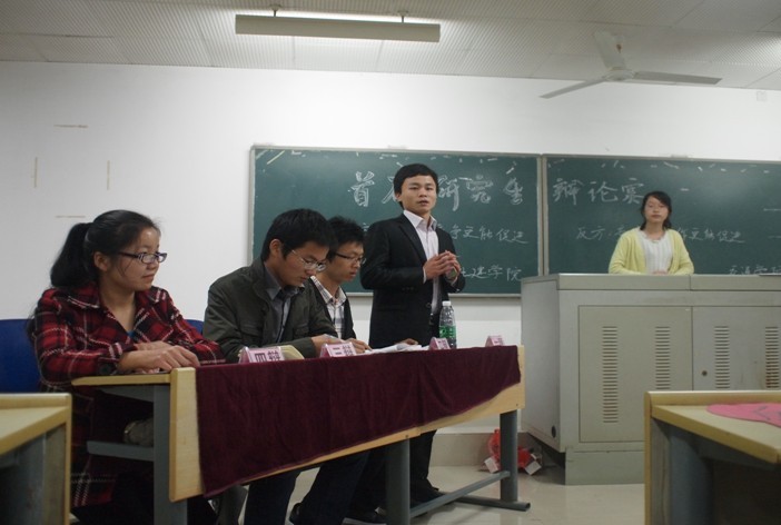 我院辩论队派出由何爱华、吴联迎、郑智雄、黄贝等四位同学组成的强大阵容。本场辩论赛的主题是“合作与竞争哪个更能促进社会的进步”。赛前辩手进行充分准备,就辩题的正反面查询收集了大量的资料和论据。