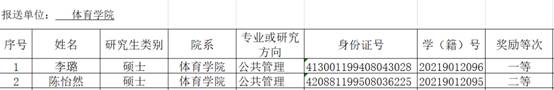 依据《长沙理工大学体育学院全日制研究生学业奖学金评审办法》”有关规定,经研究生自愿申请,学院研究生奖学金评审委员会会认真评审,拟推荐以下两名同学为我院2020-2021年度“硕士研究生学业奖学金”获奖者,现予以公示: