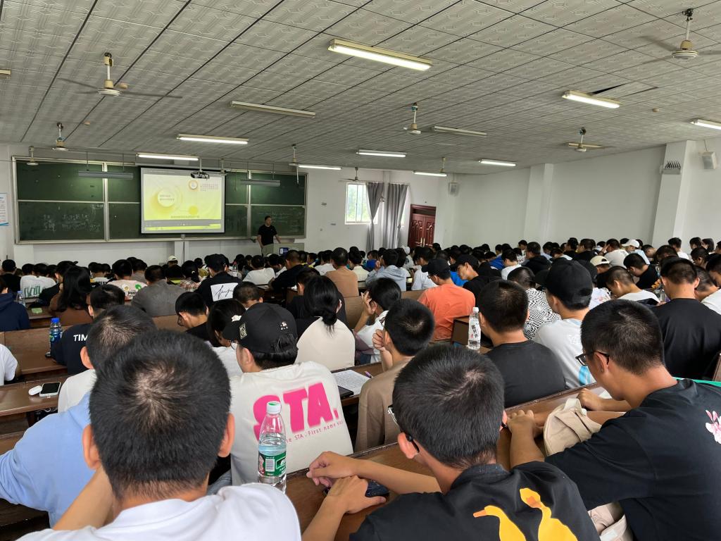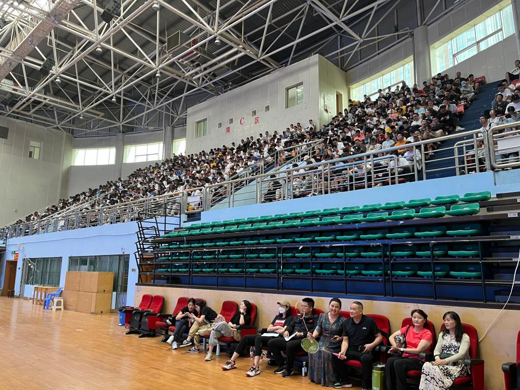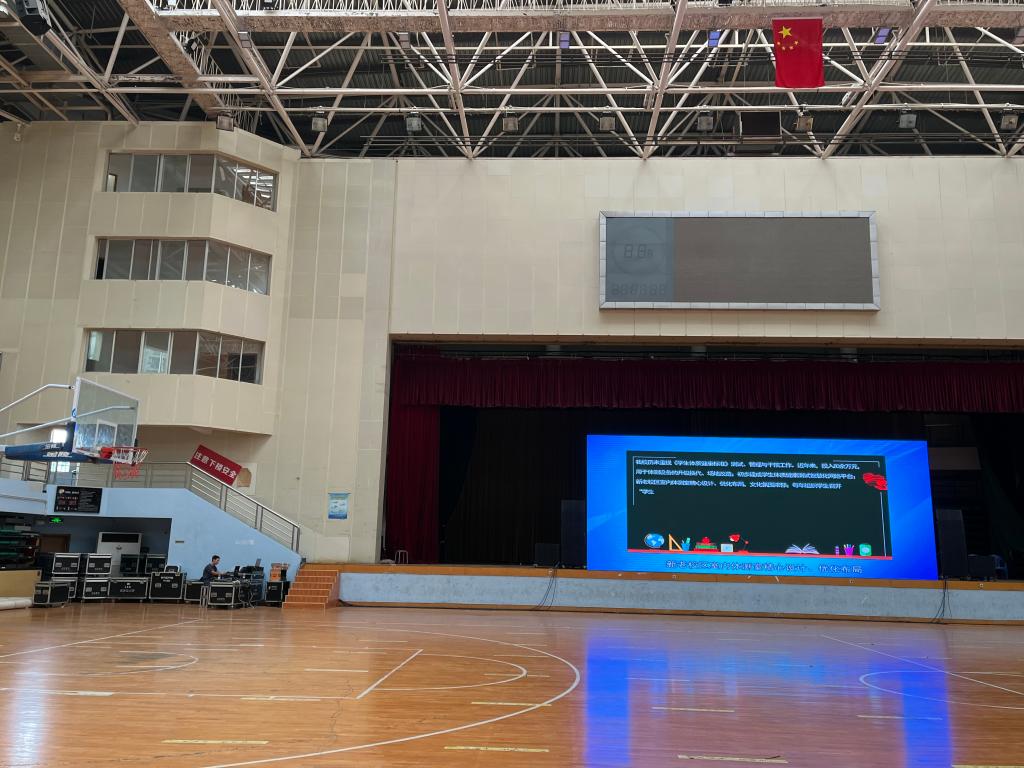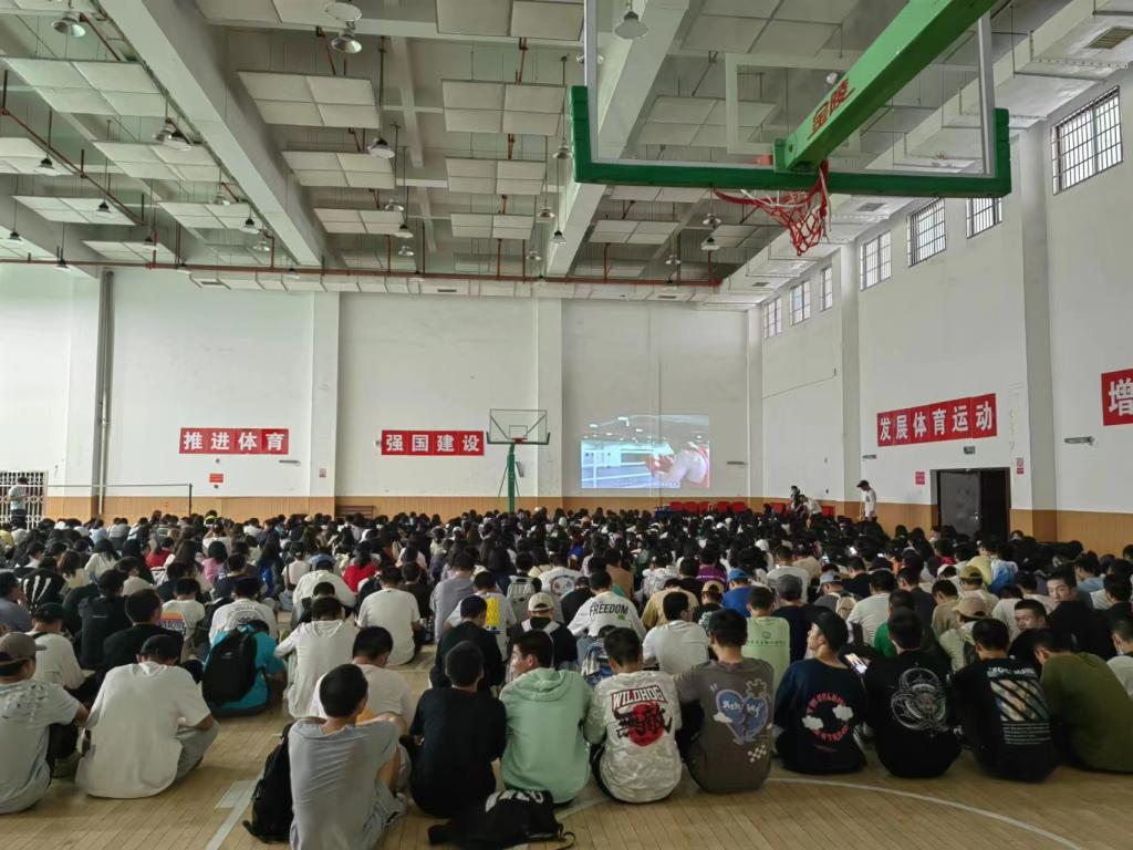 9月2日上午10:10分,金盆岭校区体育馆内主席台超大电子显示屏正播放着体育学院精心录制的新生“体育第一课”,场内近2000名新生正聚精会神观看,很多同学不约而同边看边认真做着记录。