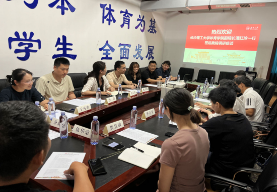 此次交流调研得到了湖南大学体育学院领导的热情接待。调研会上,湖南大学体育学院院长王祚亮、副院长吴江萍、戴兴鸿及学院部门主任详细介绍了贵校在教学、体测、群体、运动队建设等方面的具体做法和经验。随后双方围绕体育课程体系化、特色体育课程普及化、体育成绩评定标准合理化、高水平与阳光运动队持续化等内容进行了广泛深入的探讨和交流。