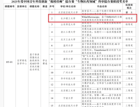 在近日落幕的2025年度中国青年科技创新“揭榜挂帅”擂台赛中,我院王新、王威老师带领的学生团队凭借“WhiteMicroscope:基于DiffuVit的白癜风进展情况识别智能诊断系统”,在清华大学、华中科技大学等全国顶尖高校组成的279支队伍中脱颖而出,成功斩获“生物医药领域”主擂台赛特等奖,这也是雷竞技官网首次获得挑战杯“揭榜挂帅”赛道特等奖,以实际成果展现了学校创新人才培养的扎实成效。