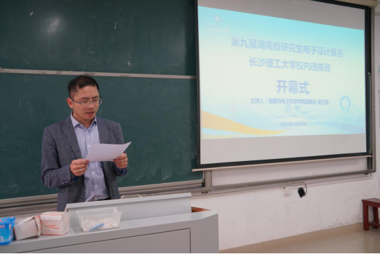 10月25日上午,“景嘉微杯”第九届湖南省研究生电子设计竞赛长沙理工大学校内选拔赛在云塘校区文科楼A305正式拉开帷幕。开幕式由物理与电子科学学院副院长张卫兵教授主持,十一名校内电子信息类专家参加开幕式。