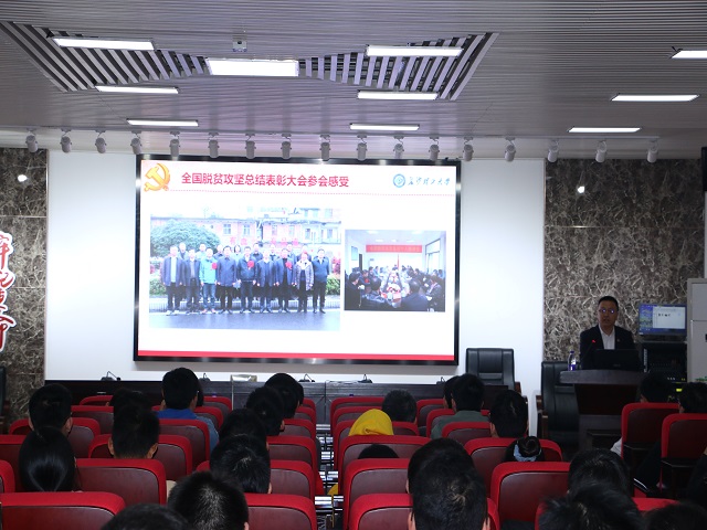 报告会上,宋刘斌老师以“把驻村积累的精神财富化作奋发前行的动力”为题,分享了自己在全国脱贫攻坚表彰大会上的感受以及在枧甘村扶贫的经历。从成立党员志愿服务队,修建贵王桥和5组通护路,到投入资金建设易地扶贫搬迁安置点、动员全校师生“带货”帮售农产品……鲜活的案例、生动的图片让全体师生仿佛亲历了山村的蜕变,也深切领会了打赢脱贫攻坚战的重大意义,更对党的政策、国家制度的优越先进性有了深刻的理解和认识。最后,宋老师寄语全体青年:“希望同学们能够在艰苦奋斗中坚定理想信念,在认真学习中练就过硬本领,在为民服务中发扬奉献精神,把科研论文写在祖国的大地上。”