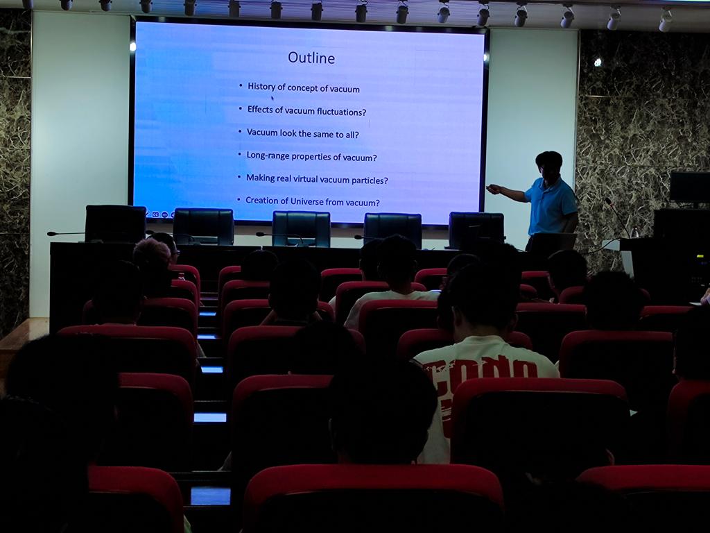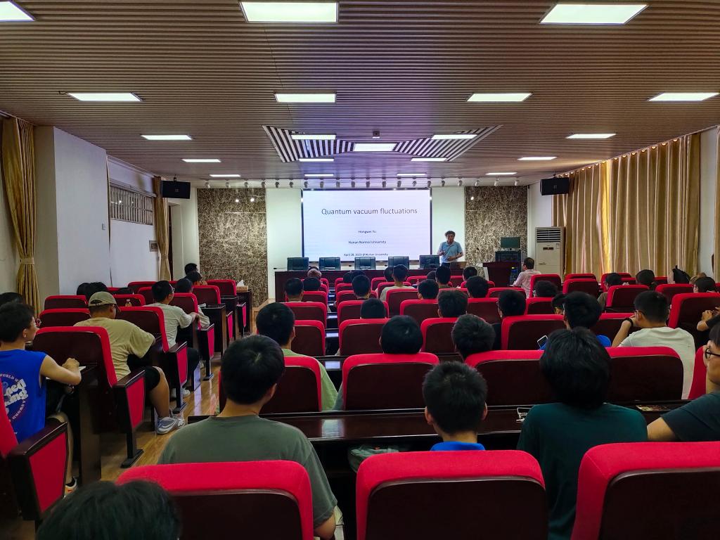 5月29日下午湖南师范大学余洪伟教授应邀来雷竞技官网理科楼B413作了一场题目为“Detecting acceleration-modified vacuum fluctuations (Unruh effect) with quantum entanglement”的学术报告。学院物理专业教师和研究生、本科生共一百余人现场聆听报告,副院长(主持工作)张卫兵主持报告会。