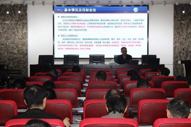 第二阶段,张卫兵副院长(主持工作)从学院基本情况、人才培养的举措和成效、持续改进的思路与举措,向全院教职工做了本科教育教学审核评估自评工作汇报。他对学院最新修订培养方案中的专业定位、特色优势和培养目标进行了详细解读,并指出学院五个专业都按照“学术型人才培养目标进行本科生人才培养,不仅响应了学校党委对理科专业的要求,也是学院今后人才培养工作的核心与方向。