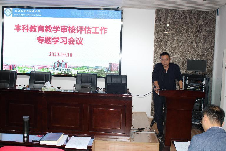 为全面贯彻党的二十大精神,积极落实教育部《普通高等学校本科教育教学审核评估实施方案(2021-2025 年)》(教督〔2021〕1 号)精神,全面落实立德树人根本任务,全面提升办学质量和育人水平,高质量完成新一轮本科教育教学审核评估工作,10月10日,物电学院在理科楼B413召开全体教职工会议,开展“本科教育教学思想大学习”活动。会议分三个阶段,由张国强书记主持
