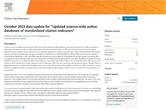 近日,美国斯坦福大学和爱思唯尔数据库(Elsevier Data Repository)发布2023全球前2%顶尖科学家榜单(World's Top 2% Scientists),榜单分为关注整个学术生涯迄今影响力的“终身科学影响力排行榜”(全球上榜204643人,中国9013人),以及聚焦本年度学术成就的“年度科学影响力排行榜”(全球上榜210198人,中国23484人)。我院张卫兵、范志强、曹广涛3位学者入选全球前2%顶尖科学家“年度科学影响力排行榜”(全校39人)。