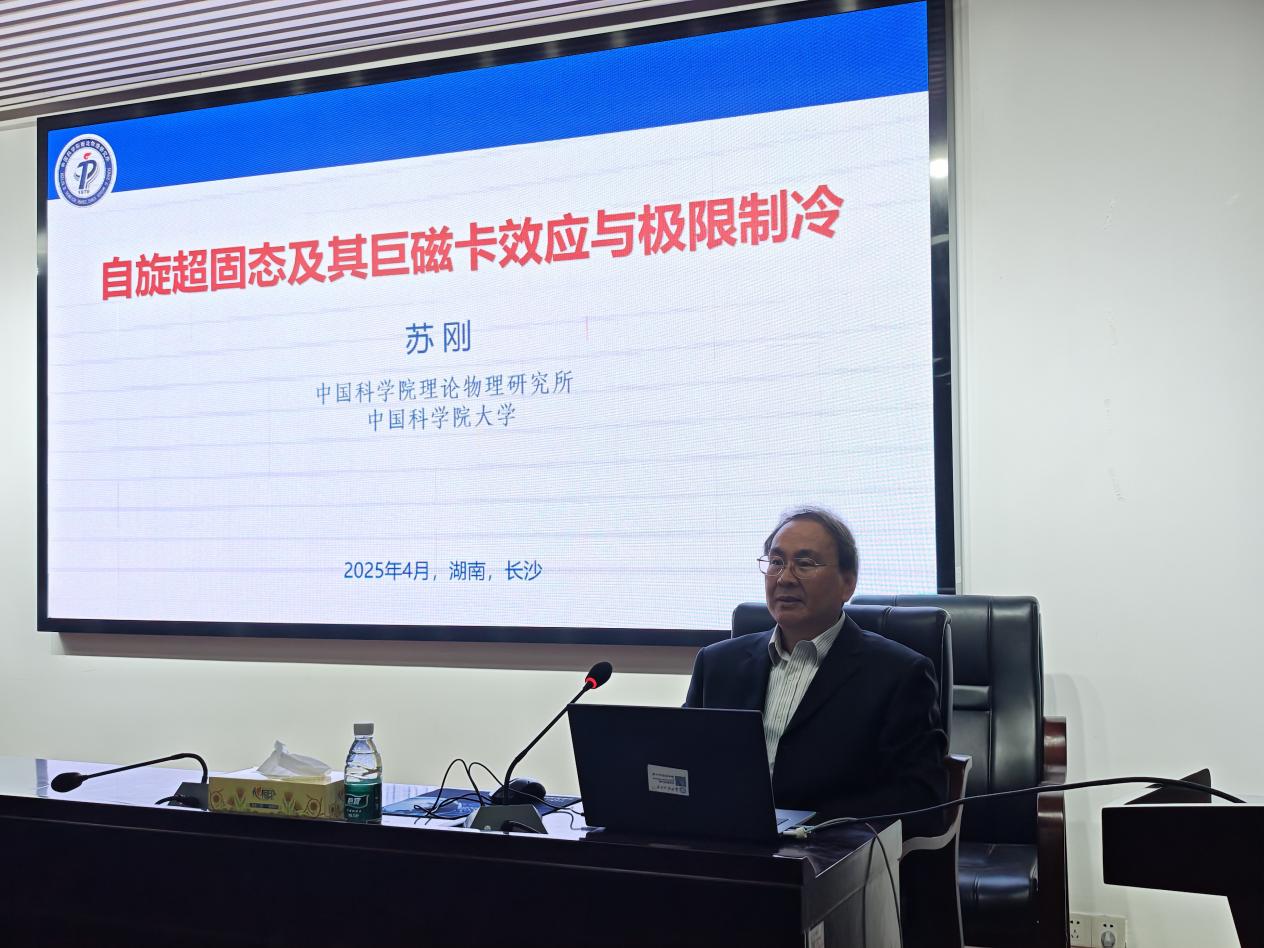 2025年4月26日下午,中国科学院理论物理研究所苏刚教授应邀来雷竞技官网交流指导,在理科楼B413会议室作了题为《自旋超固态及其巨磁卡效应与极限制冷》的学术报告。我院六七十余名师生积极参加了此次学术报告会,会议由邓科教授主持。