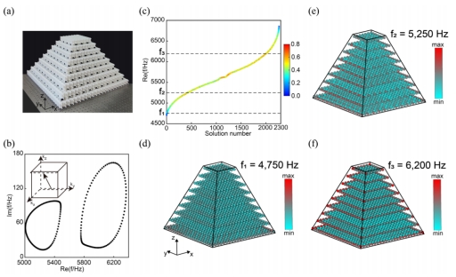 图2. 三维声子晶体中表面依赖的趋肤效应观测。(a)具有金字塔形状的奇异线半金属声子晶体样品。(b)频谱缠绕。(c)频谱的实部。(d)-(f)面趋肤效应测量。