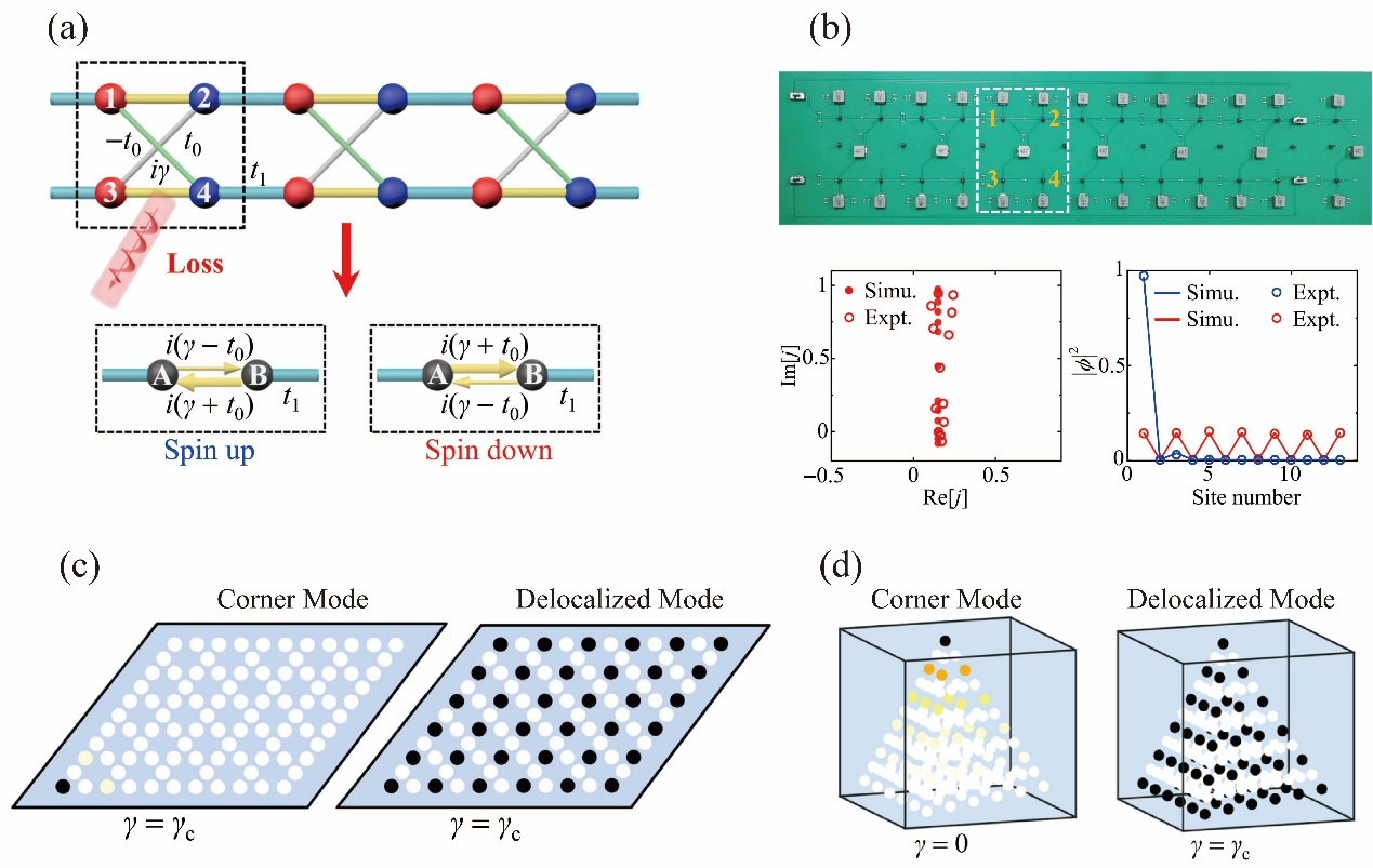 图1. (a)一维紧束缚模型。赝自旋自由度与损耗结合,实现了自旋极化的非互易纯虚耦合。(b)一维电路系统中端态的离域现象观测。(c)和(d)二维和三维电路系统中角态的离域现象观测。