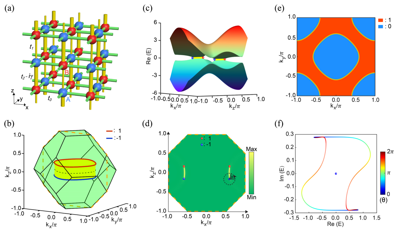图1. (a)奇异线半金属紧束缚模型。(b)-(d)包含奇异环的体色散。(e)波函数缠绕数。(f)能谱缠绕。