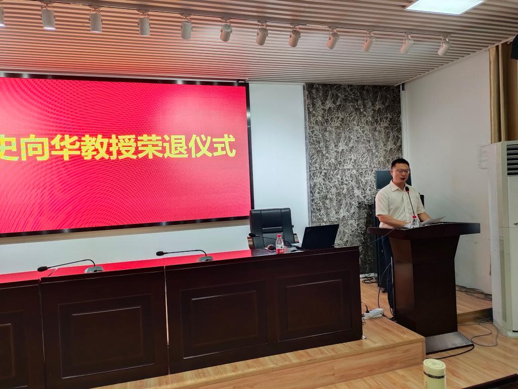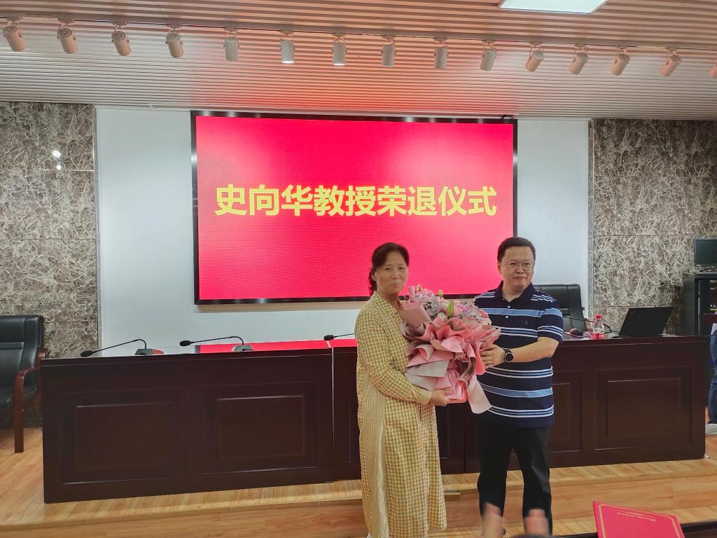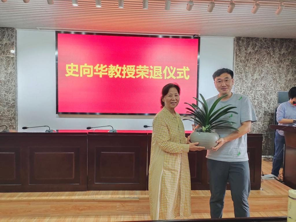 副院长(主持工作)张卫兵为史向华教授颁发了荣退证书,他对史教授为学院人才培养,青年教师传帮带等作出的贡献表示钦佩,祝福史老师退休生活丰富多彩。学院副院长范志强代表学院全体教师向史向华教授献上鲜花和贺卡。