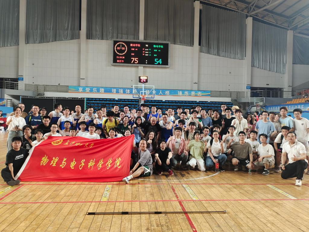在刚刚结束的长沙理工大学第九届篮球比赛中,物电学院篮球队获得第四名的好成绩,创造学院篮球比赛的历史最佳战绩。此次篮球比赛,学院领导高度重视,党委书记张国强、副院长(主持工作)张卫兵分别作为领队和教练并亲自上场,副院长兼工会主席刘斯作为队员参加中场投篮比赛,副院长范志强场场前往赛场加油助威。在队长习志龙老师的带领下,球队重视赛前训练和比赛的排兵布阵,比赛过程中队员们积极投入,团结协作,顽强拼搏,克服种种困难,比赛场面精彩纷呈。值得一提的是老师们也特别关心每场比赛、亲自到场为球队加油,学生拉拉队更是给力,他们为老师们加油助威的场面成为球场的一道风景线,这张奖牌来之不易,凝聚了学院全体师生的共同心血。物电篮球队首次进入学校男篮四强,历史性突破!场内队员奋力拼搏、场外师生加油助威均彰显了物电学院团结、敢拼、有情怀、务实的集体良好形象。