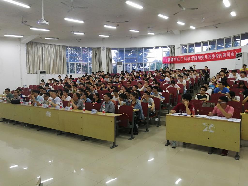 6月4日晚上7:00,物电学院2020年研究生招生校内宣讲会在云综教B-102举行。研究生院副龚文斌、物电学院院长刘其城、党委书记唐立军、副院长丁开和、张卫兵,学院各学科科研团队和研究小组负责人、院科研办、学工办等老师,校内近260名学生参加了本次宣讲。会议由院长刘其城教授主持。