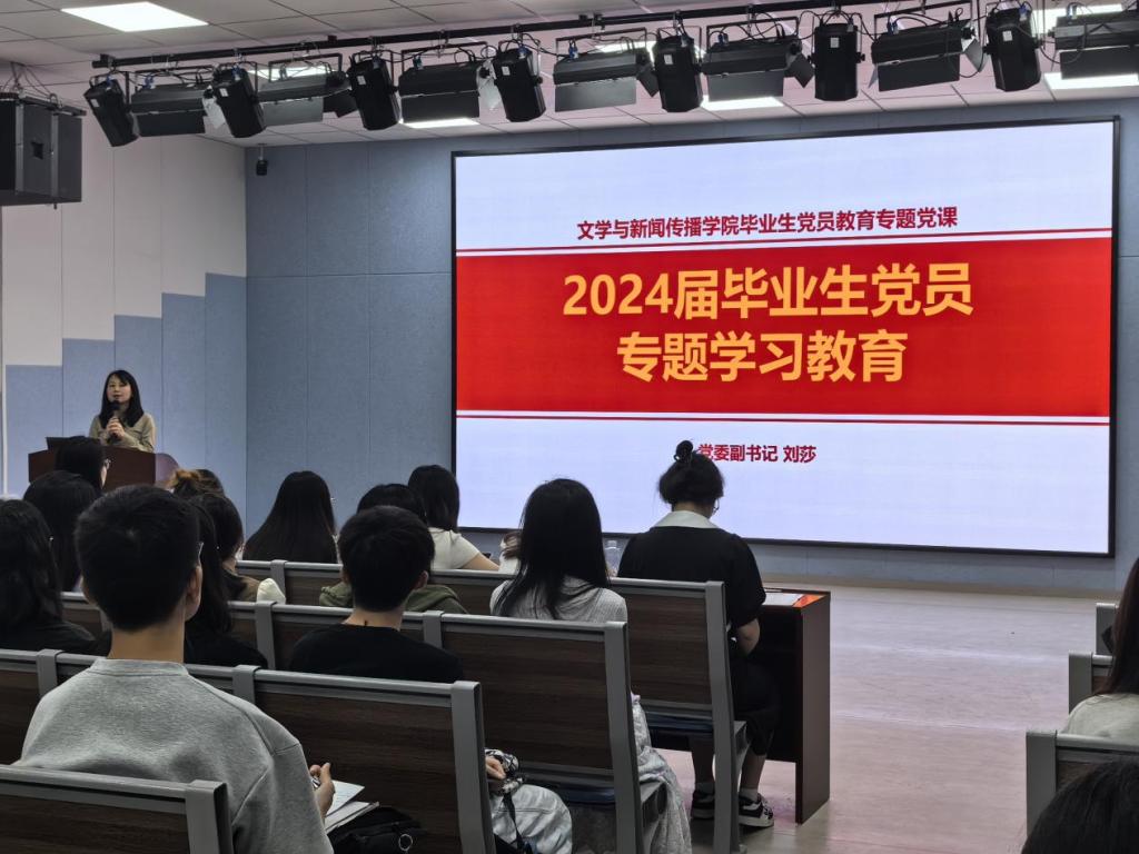 毕业生党员群体作为毕业生中的先进群体,不仅肩负着当代大学生的历史使命,还承担着当代党员应尽的责任。为了进一步强化毕业生党员的服务意识和责任意识,2024年6月4日,长沙理工大学文学与新闻传播学院在九教一楼报告厅举办了文新学院2024届毕业生党员专题学习教育活动,活动由文新学院党委副书记刘莎主持。