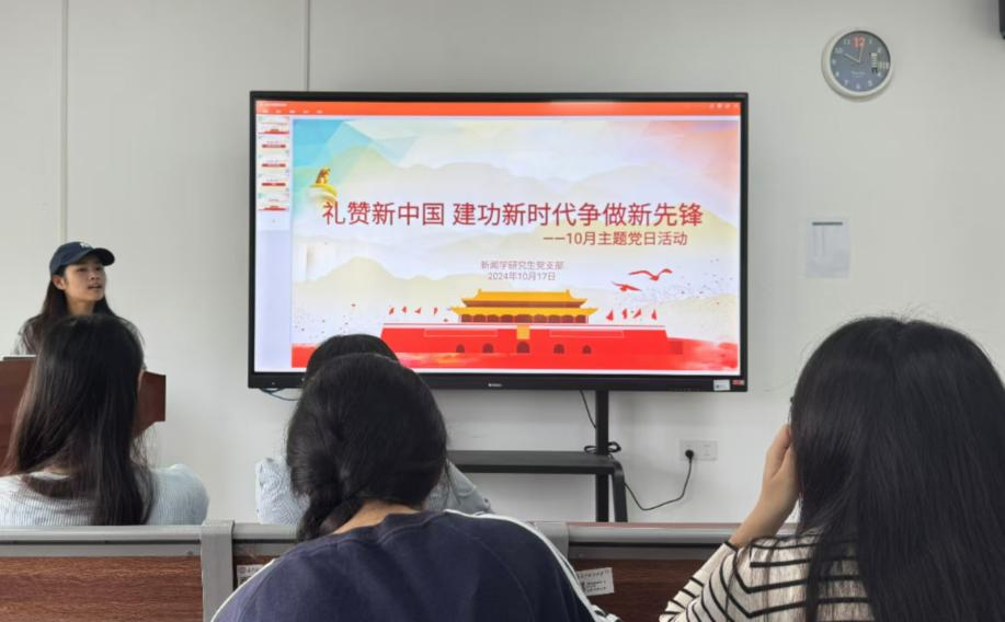 讲好“一课”,夯实理论。新闻学研究生党支部李晓琦同志以“追梦新时代,奋斗新征程”为题进行微党课宣讲,分四个部分讲述了新中国成立的伟大意义和党的光辉历程,并对党的二十届三中全会精神进行了全方位的讲解与深度剖析。中国语言文学党支部杨婧同志表示,在新时代的征程中,我们应当矢志不渝跟随党的步伐,高举中国特色社会主义伟大旗帜,学习党的二十大精神,为实现中华民族伟大复兴的中国梦而不断奋斗。党员同志们也要深刻理解总书记的讲话精神,不负党和人民的嘱托。