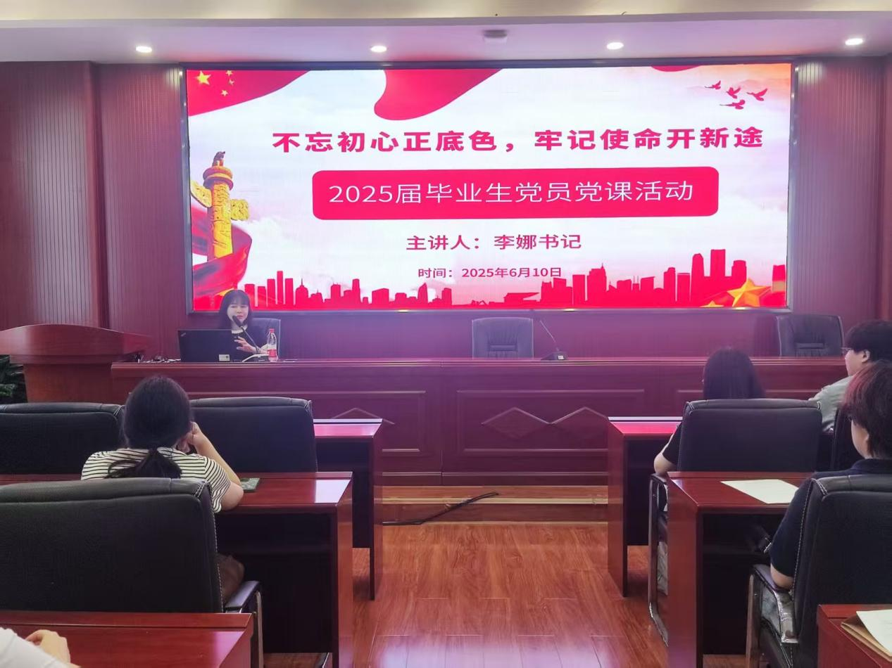 为进一步加强毕业生党员党性教育和党纪教育,激励他们坚定理想信念,牢记党员责任,6月10日下午,长沙理工大学文学与新闻传播学院在金盆岭校区9号教学楼218教室举行2025届毕业生党员党课活动,2025届全体毕业生党员参会,学院党委副书记(主持工作)李娜以《不忘初心正底色,牢记使命开新途》为题,为全体毕业生党员上专题党课。
