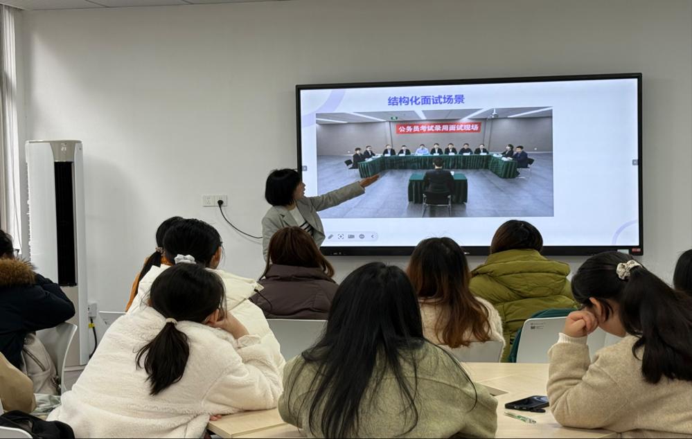 梁力丹老师围绕面试礼仪、结构化面试、考官面谈三大模块展开深度指导。在礼仪规范方面,从着装细节与仪态管理,对如何自信表达给出了详细建议。针对结构化面试,结合当下社会热点拆解高频题型,梳理应答思路,并组织同学们现场作答交流。在考官面谈环节,从个人背景、职业规划、人岗匹配等维度,指导学生优化应答策略。