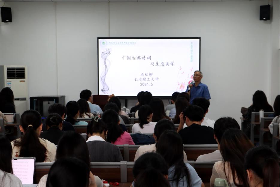 2024年5月21日下午,长沙理工大学文新学院通识讲座暨人文素质大讲堂之“中国古典诗词与生态美学”专题讲座在金盆岭校区9教417室举行。湖南省人民政府参事、中文系二级教授成松柳老师为长理师生带来了一场富有人文气息的古典诗词盛宴。成松柳教授首先对“古典诗词生态美学的艺术呈现”进行了阐述。他将中国古典诗词生态美学的呈现方式分为“自然本身的和谐”、“人与自然万物的和谐”、“人与社会的和谐”三个方面,以李白、王维、刘禹锡、张孝祥、朱熹等人的传世诗词为例,围绕“楼观岳阳尽,川迥洞庭开”“相看两不厌,唯有敬亭山”“空山不见人,但闻人语响”“试问西山雨,何如湘水春”进行了诗意解读,详细阐释了“主客一体”“仁爱万物”“江山之助”“天地境界”等观点。成松柳教授提出:中国古代诗歌并非纯粹客观地描摹自然风物,古代文人将浓厚意趣与真挚情感熔铸于自然山水,体现了对自然的审美感知,这种与自然的亲近友好关系承载着博大深沉的生命情怀。