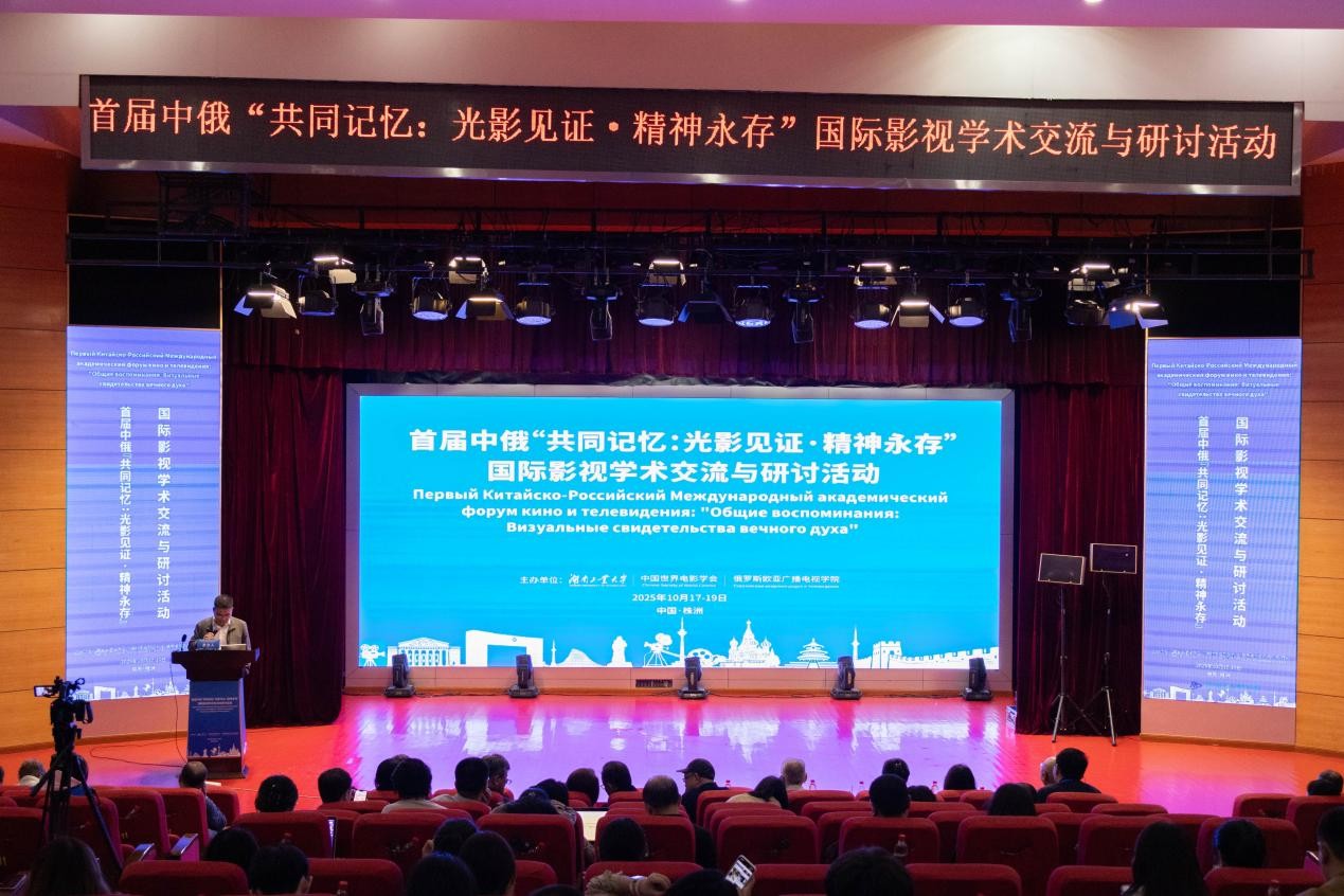 2025年10月18日,首届中俄“共同记忆:光影见证•精神永存”国际影视学术交流与研讨活动在湖南工业大学顺利举办。本次活动由湖南工业大学、中国世界电影学会、俄罗斯欧亚广播电视学院共同主办,湖南工业大学语言文化与传媒学院、上海大学上海电影学院、海口经济学院南海艺术与科技学院协办。近200位来自中国、俄罗斯、日本、韩国的影视专家、学者参加活动,本次活动围绕中俄电影电视文化交流为核心论题,共同探索国际影视合作的新路径、新机制与新生态。文学与新闻传播学院院长刘建新、副院长戴钰、魏桃初等领导带领学院部分老师及戏剧与影视专业部分学生参与活动。