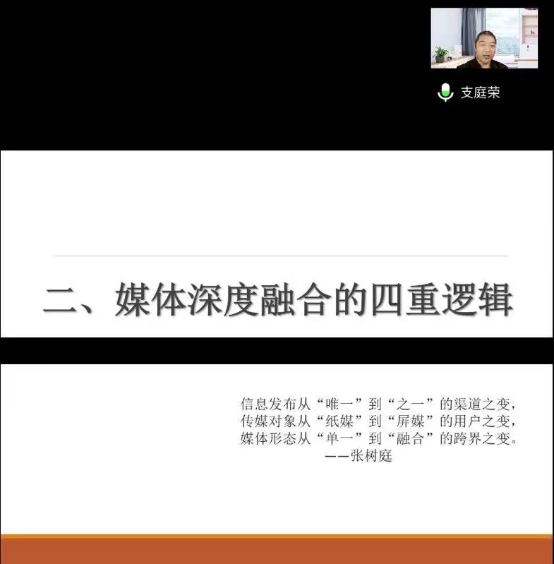 支庭荣教授“全媒体的逻辑”“互联网的逻辑”“运营的逻辑”“体系的逻辑”对媒体深度融合做了详尽分析支教授列举多个媒体融合的现实案例其中以“怀集县融媒体中心媒体矩阵”为主展开论证由多媒体向全媒体逻辑的转变他还提出当下的媒体融合最大的障碍是技术的论断本质是对主流媒体渠道失灵的一种阐述呼吁媒体要将内容与技术更好的结合