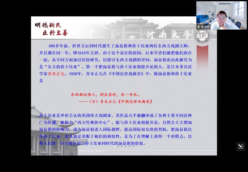 2022年11月19日上午9:00,河南大学李伟昉教授应邀为我院师生开展以“汤显祖:推陈出新的巨擎”为主题的讲座。此次讲座线上线下同步进行。文新学院党委委员郑劭荣教授担任讲座主持人,副院长周云鹏副教授、中文系周静副教授、黄宇副教授、向双霞老师、王莉老师等出席了本次讲座。22级中文研究生及22级汉语言文学本科生全体参与听讲。郑劭荣教授对李伟昉教授的到来表示热烈欢迎,并对其在国内比较文学方向取得的成绩表达了衷心的祝贺。