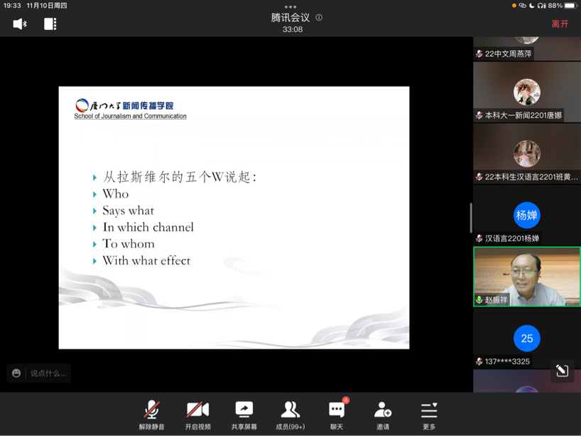 讲座伊始,赵振祥教授对拉斯维尔的五个W”进行了简单的阐释,他以五个“W”为基本框架,开始了正式的讲授。