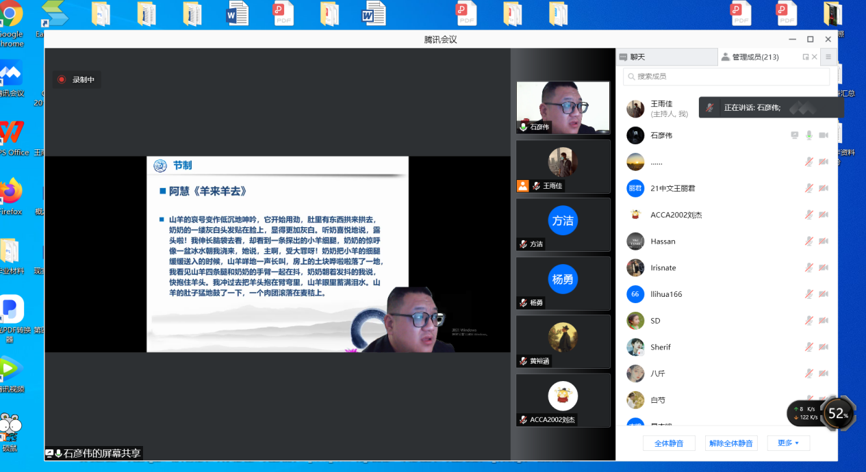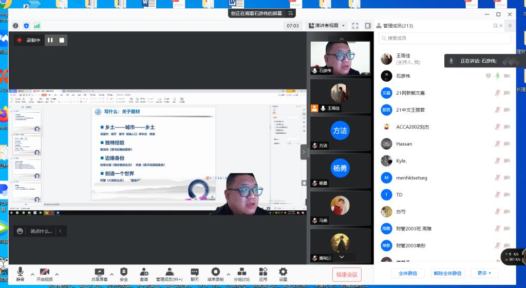 2021年10月29日晚19:00,青年作家石彦伟受邀为我院师生开展了以“散文创作理路与技法”为主题的线上讲座。本次讲座由文学与新闻传播学院王雨佳老师主持,此次会议得到了雷竞技官网师生及石彦伟老师的作家朋友的热烈响应,共有220人参与讲座。
