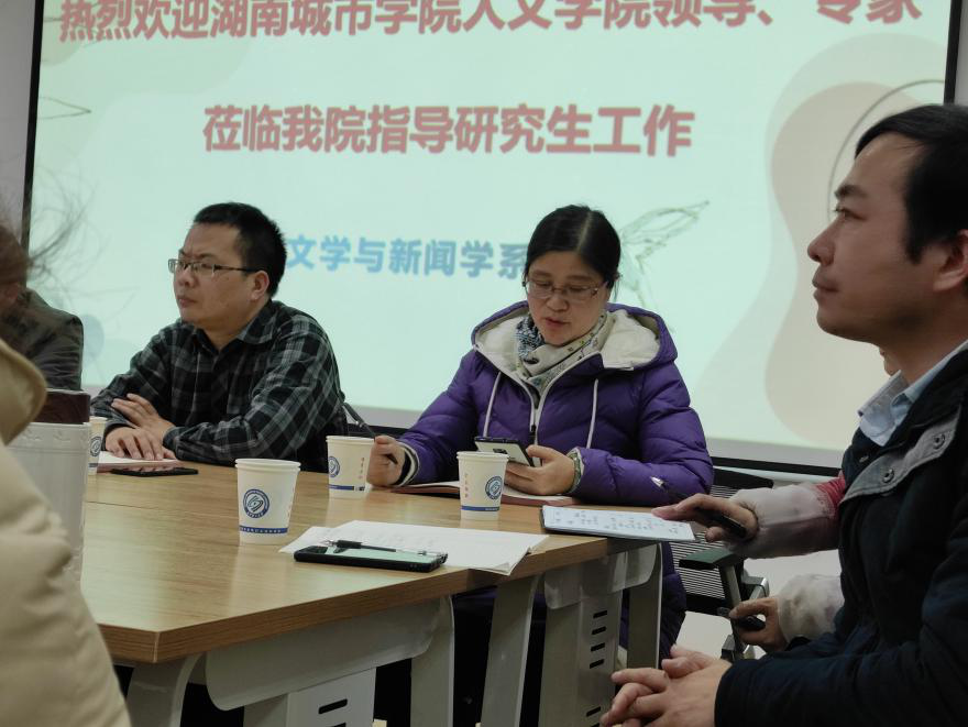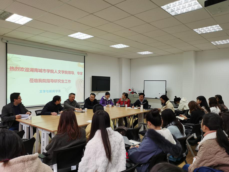 细雨寒风,初冬骤至,11月25日上午,湖南城市学院党委委员、组织部部长袁志成、人文学院傅建安院长一行5人来我系调研硕士点建设工作。长沙理工大学文新系主任周云鹏、郑劭荣教授及中文20级全体研究生参加了此次会议。调研交流活动在金盆岭校区7教306举行。