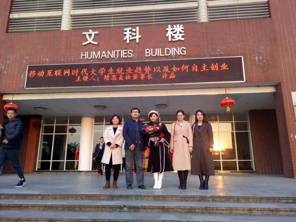 2017年12月19日下午,上海续蕊美妆公司董事长、雷竞技官网优秀校友许磊女士为学院学生作《移动互联网时代大学生就业趋势及如何自主创业》报告交流并受聘为学院创业导师,本次报告交流活动在文科楼C202举行。文法学院院长王新生、文法学院副院长周云鹏、党委副书记魏桃初以及学工办辅导员楚艳鸽老师出席本次讲座。