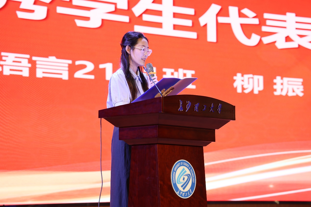 听完老师的肺腑之言,优秀学生代表柳振分享大学收获,以自身经历告诫学妹学弟们要尽早确定大学毕业后的方向,不要自我设限,勇敢尝试,成长为优秀的长理文新人。