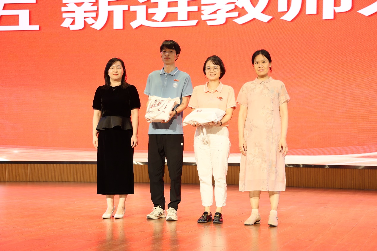 师徒结对传帮带,薪火相传铸未来。接着举行新进青年教师入职仪式和本科新生班级班主任、下班党员、下班团员受聘仪式。入职仪式上,培养导师冯利华、戴钰为两位新进青年教师刘海兰和赵华健佩戴校徽,赠送学院教学文创套装并合影留念。
